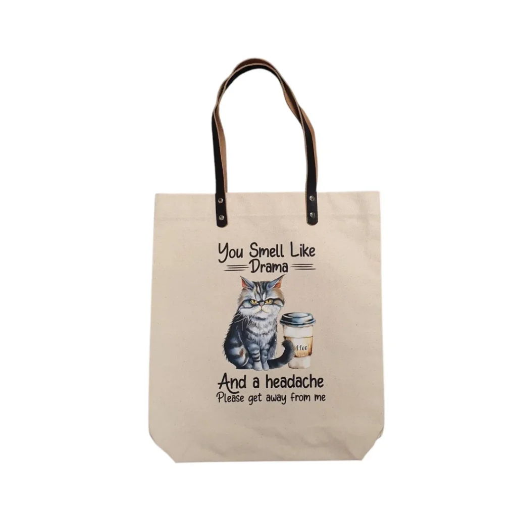 Hand Printed Luxury Canvas Tote Bag – Leather Handles – DRAMA CAT