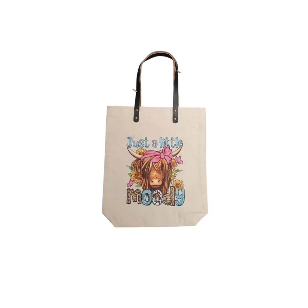 Hand Printed Luxury Canvas Tote Bag – Leather Handles – JUST A LITTLE MOODY HIGHLAND COW / COO