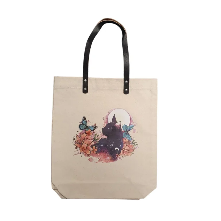 Hand Printed Luxury Canvas Tote Bag – Leather Handles – BLACK CAT IN MOONLIGHT