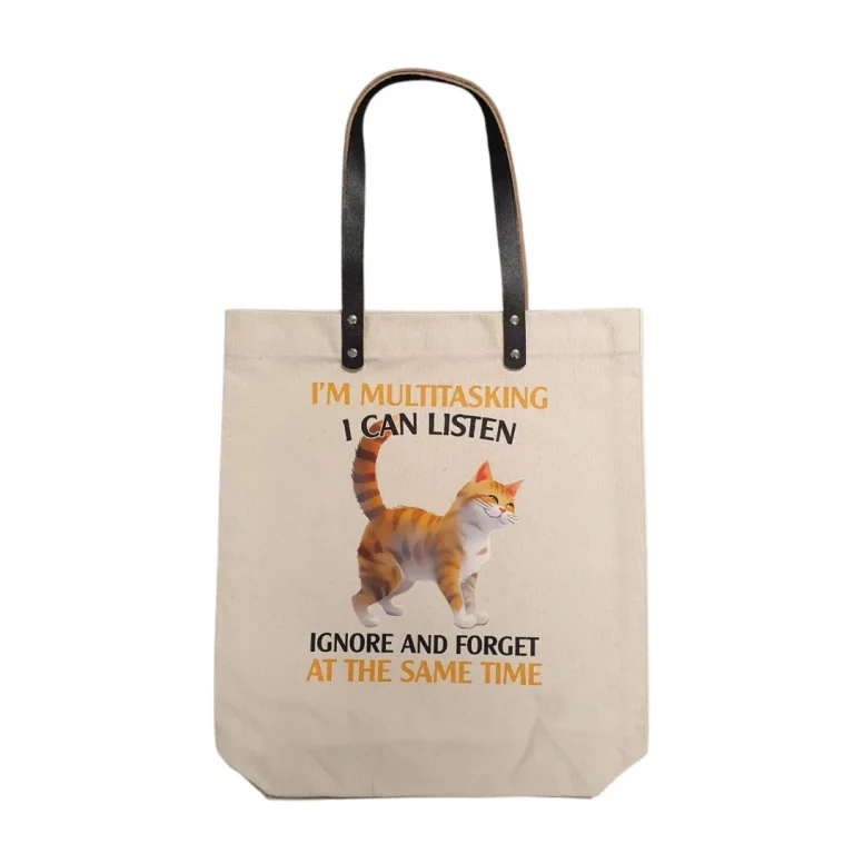 Hand Printed Luxury Canvas Tote Bag – Leather Handles – MULTITASKING CAT