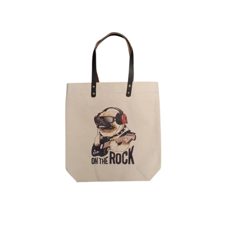 Hand Printed Luxury Canvas Tote Bag – Leather Handles – ON THE ROCK PUG DOG