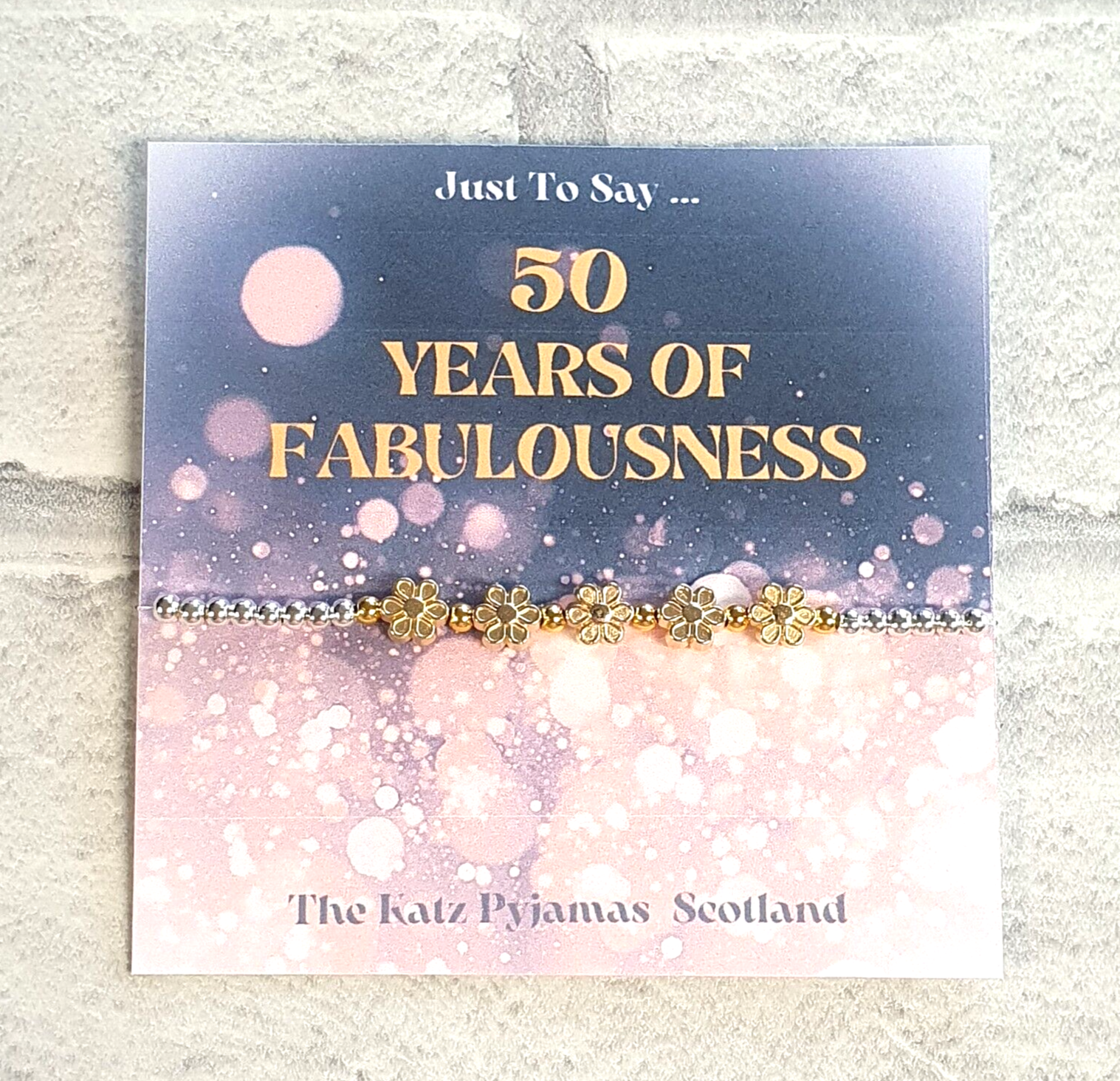 Just to Say.. 50th Birthday Stretchy Bracelet – Joma Style – Silver Plated – 5 Gold Flowers