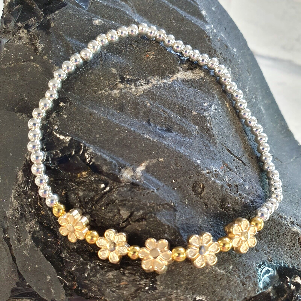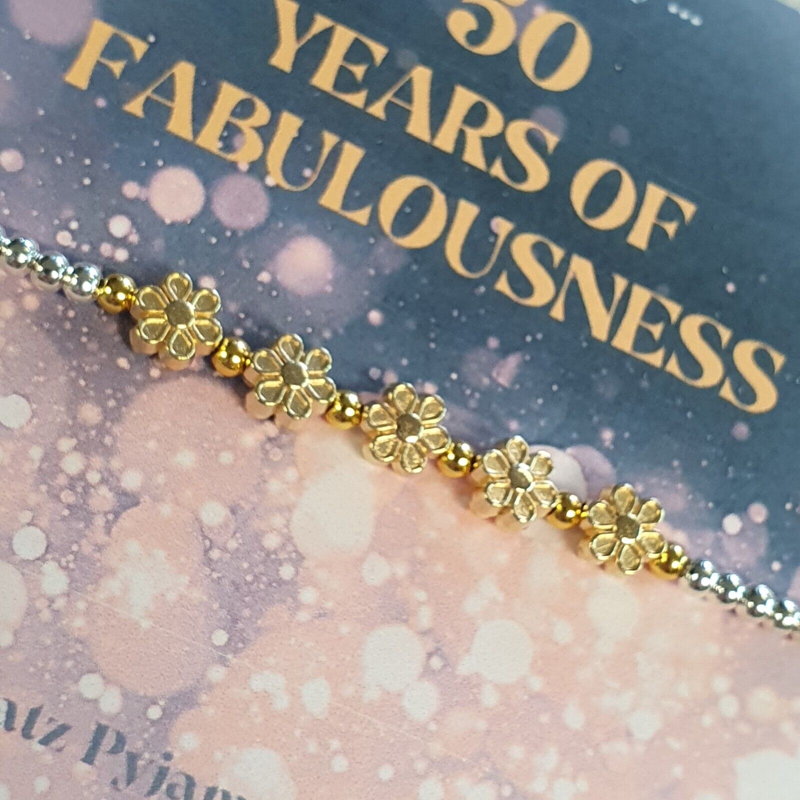 This pretty bracelet features 5 shiny gold plated flower bead charms to signify 5 fabulous decades!