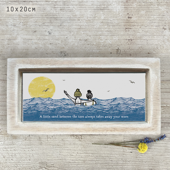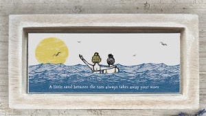 This wooden picture shows two women swimming in the sea under a lovely sun with birds above – having a great time!