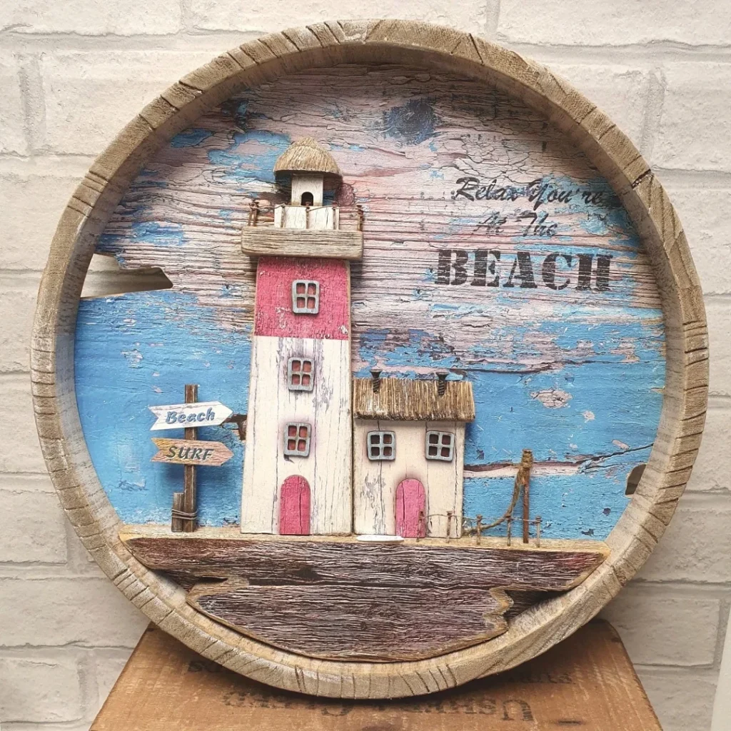 This rustic style wooden piece features a 3D beachy scene with a lighthouse and cottage. There is a little sign pointing to the ‘beach’ or ‘surf’.