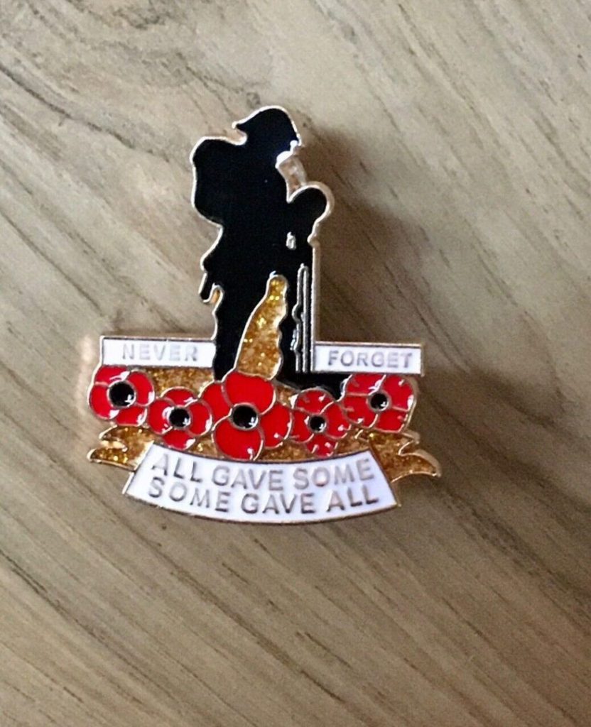 This enamel brooch depicts a soldier with his head bowed over his gun as a mark of respect. He is standing on a bed of poppies. Over a banner that says “All gave some, some gave all”