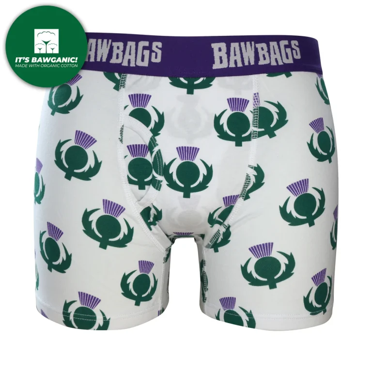 Bawbags Cotton Boxer Shorts White – Thistle Design – Size Small – Boxed